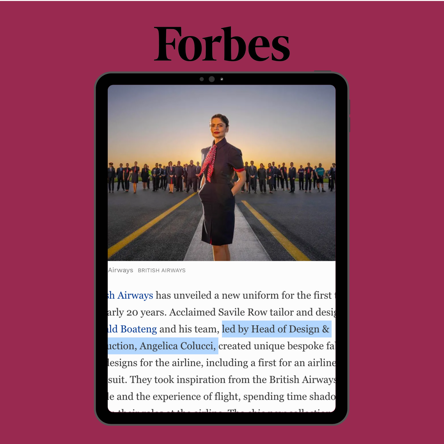 Forbes article by Joanne Shurvell highlighting the new British Airways uniform by Ozwald Boateng, with Angelica Colucci leading the project as Head of Design.