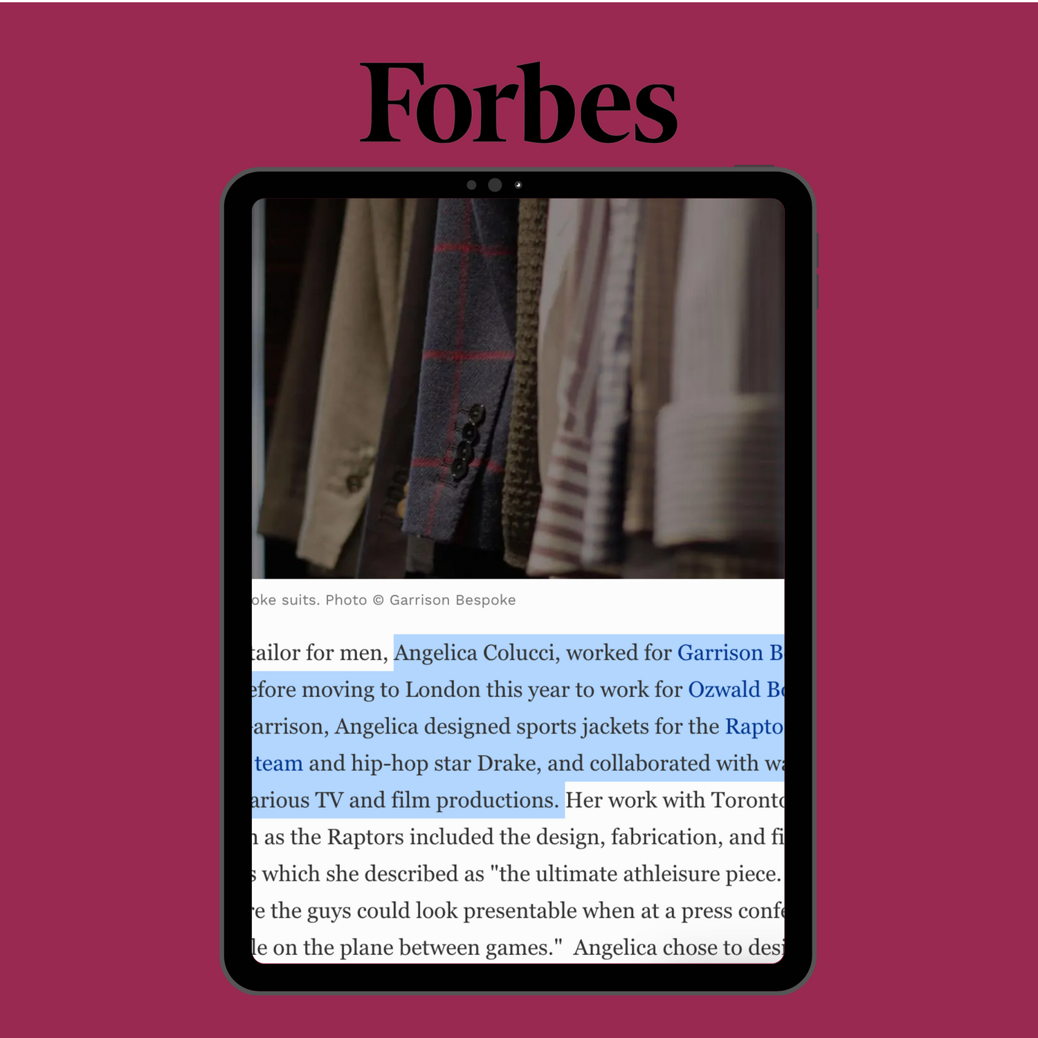 Forbes article by Joanne Shurvell featuring Angelica Colucci as one of the few women designing menswear, particularly on Savile Row.