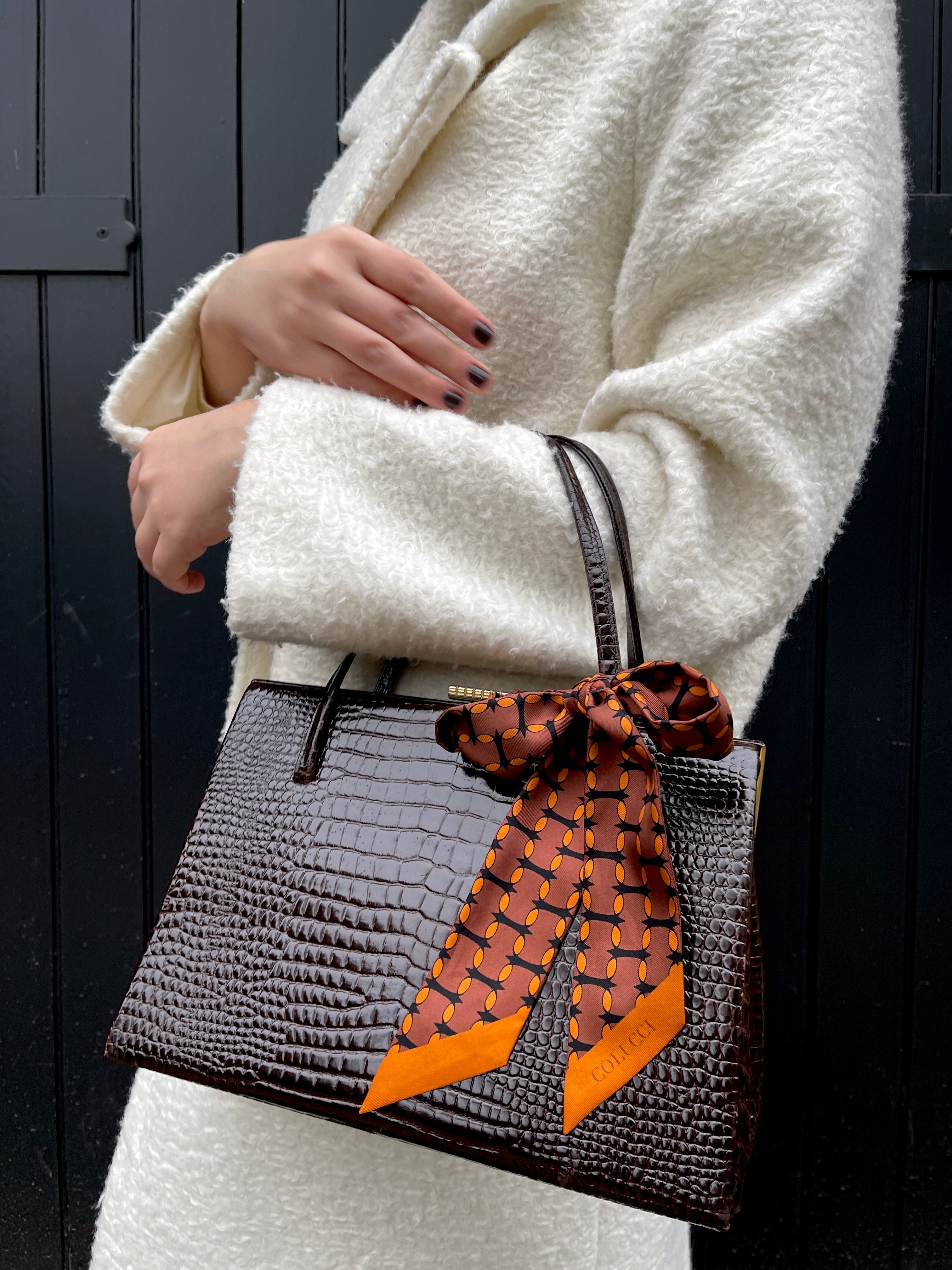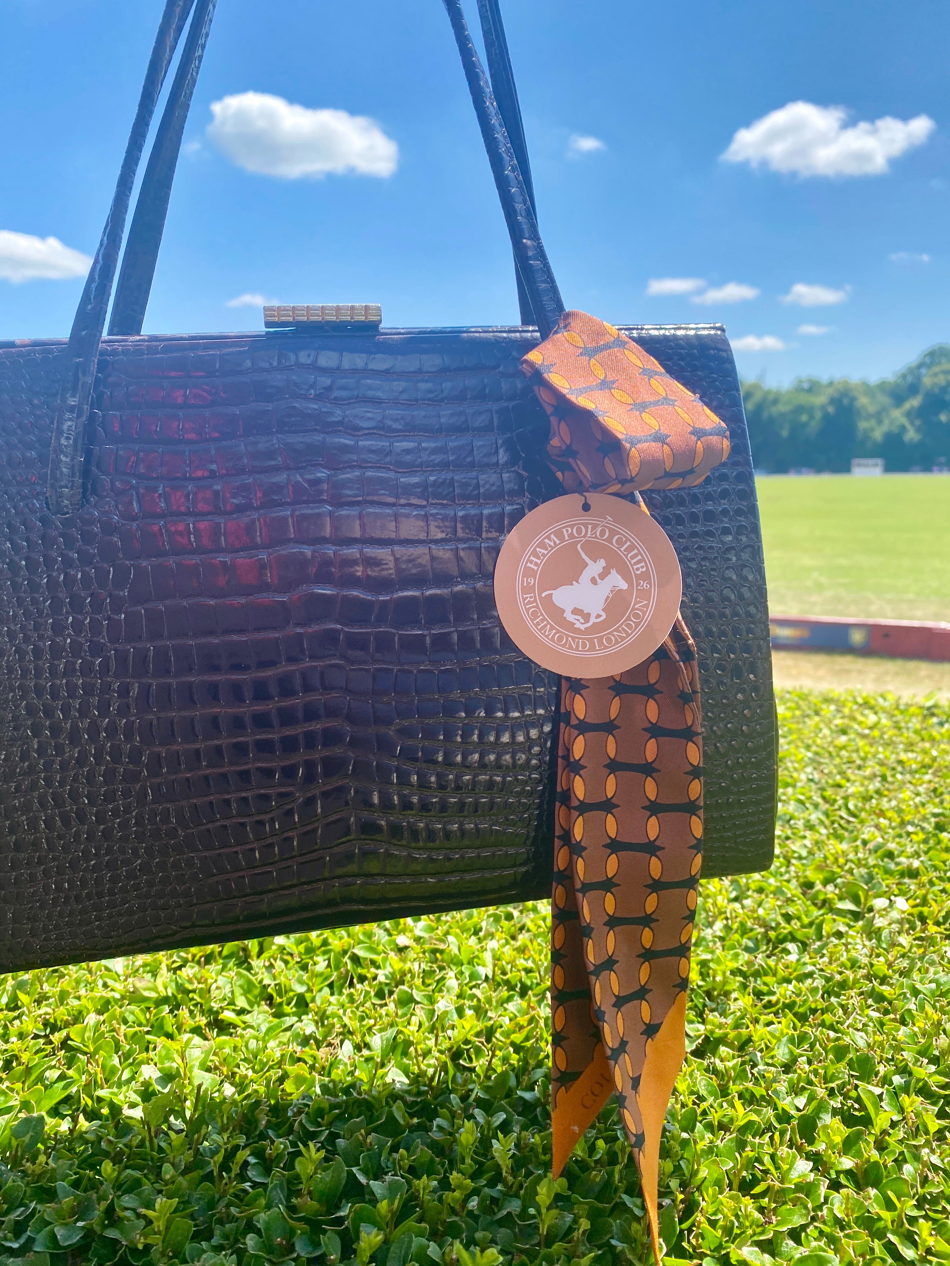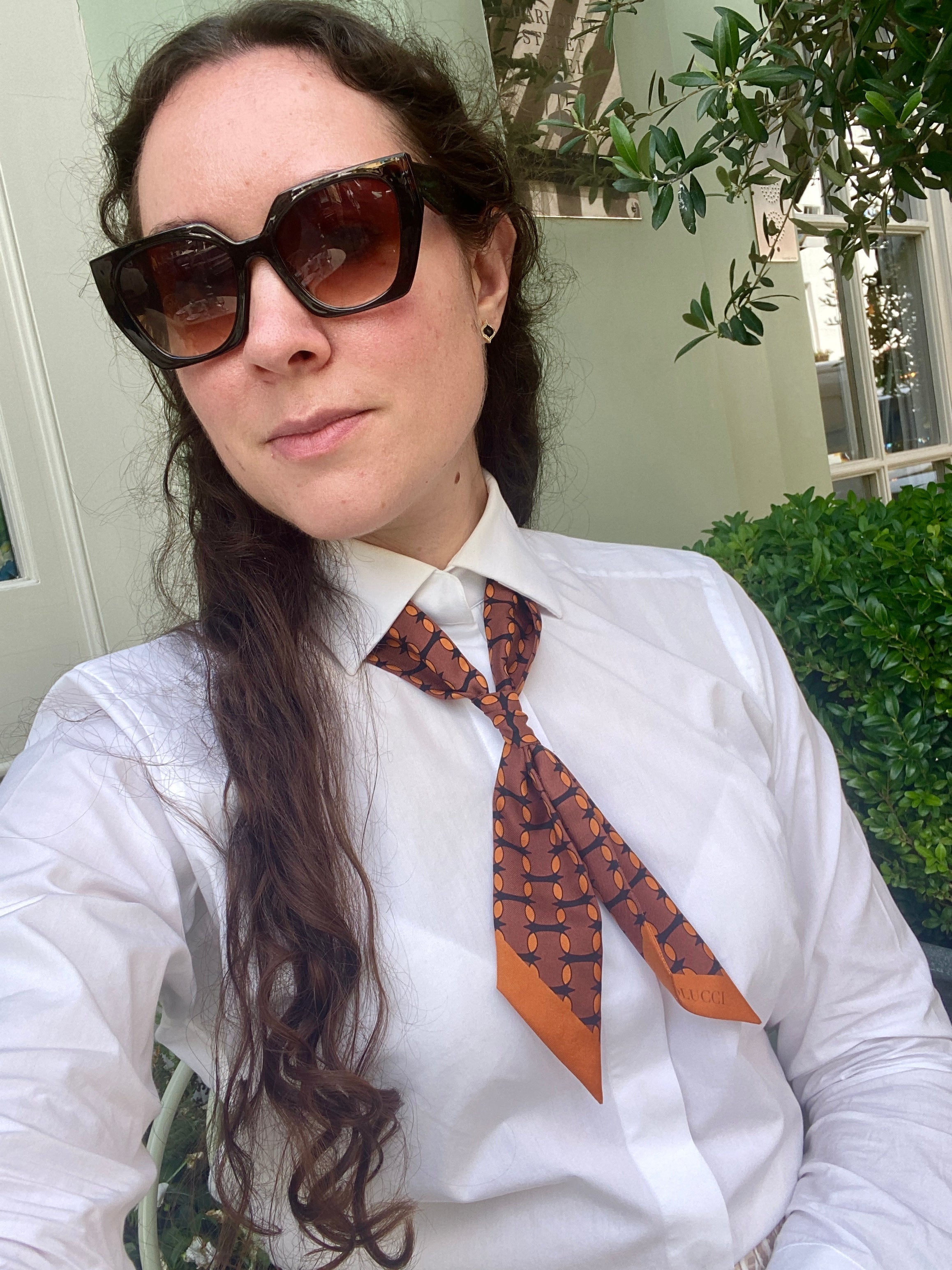 This brown and orange monogram silk twilly brings bold 1960s-inspired colours into a playful, modern accessory—perfect for wearing around your neck, tying onto a bag, or styling in your hair.